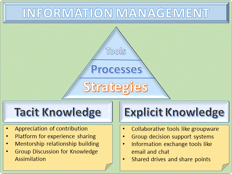 Typically, the knowledge which is extracted from information would be classifiable into tacit and explicit knowledge. Tacit knowledge is knowledge which resides within the minds of the employees. It is never documented formally. Explicit knowledge is the knowledge that is documented and is available through sharing. Effective knowledge management, or effective information management has to address both the tacit and explicit knowledge which is residing within an enterprise.