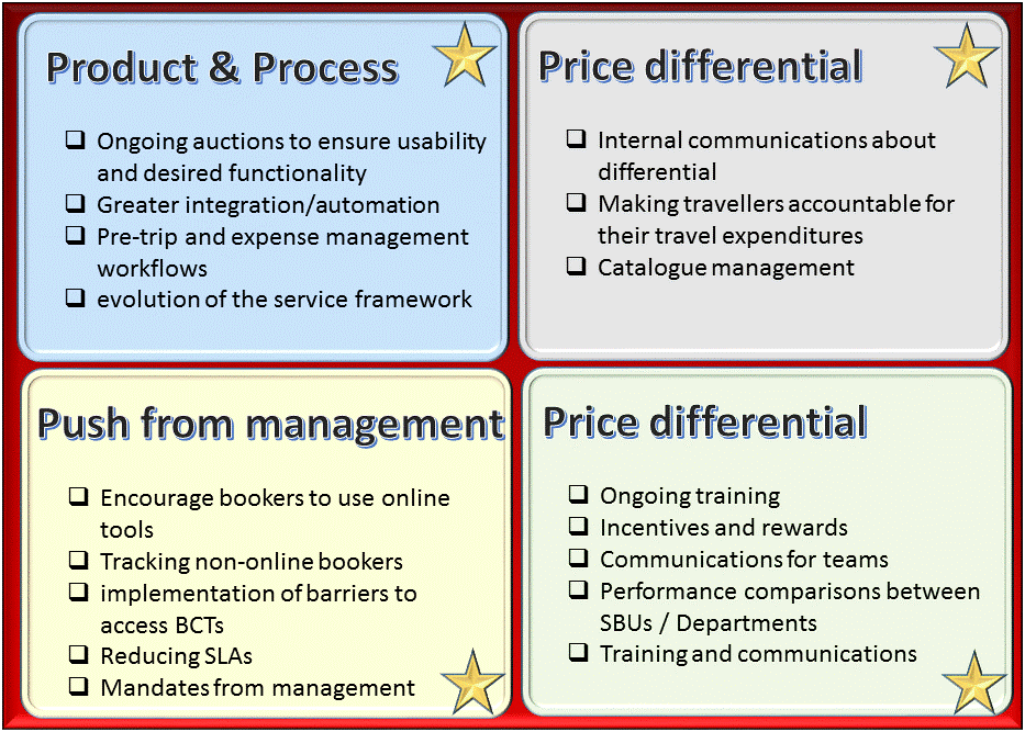 Push from management: actions to encourage bookers to use online tools, such as tracking non-online bookers; implementation of barriers to access business travel centers (BTCs), including voice prompts directing travelers to the booking tool; reducing service level agreements (SLAs); and mandates from management. Mandatory actions are perceived as the most effective, but were not widely used – perhaps, because of their negative implications and incompatibility with company culture. By contrast, tracking non-users was rated as quite effective and often used, offering an effective compromise for those companies seeking to rapidly enforce online booking.