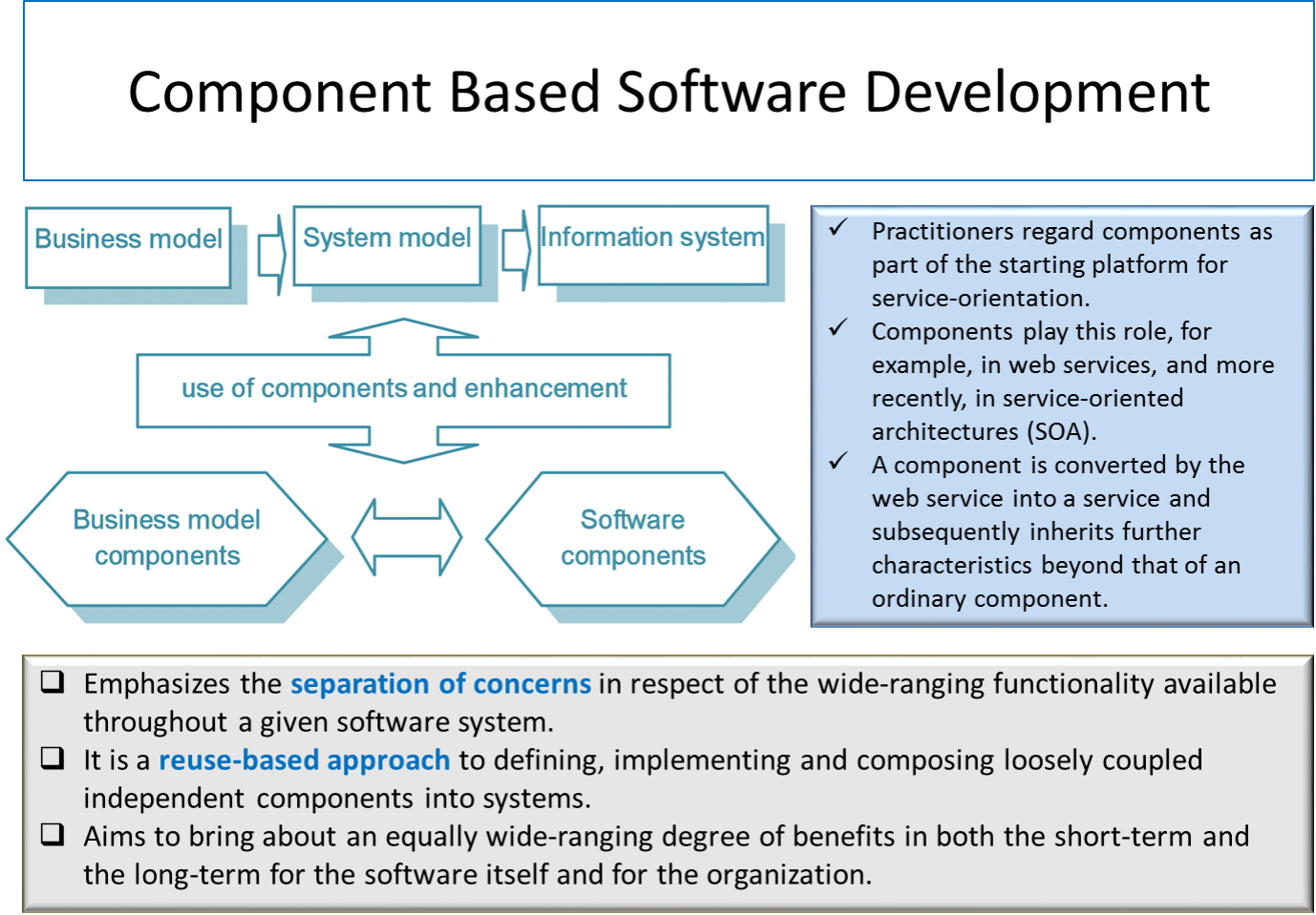 Component based software development emphasizes the separation of concerns in respect of the wide-ranging functionality available throughout a given software system. It is a reuse-based approach to defining, implementing and composing loosely coupled independent components into systems. It also aims to bring about an equally wide-ranging degree of benefits in both the short-term scenario and the long-term scenario for the software itself and for the organization.