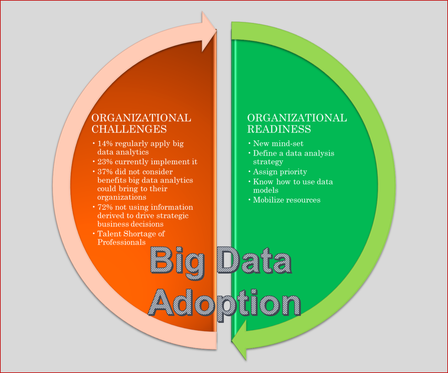 Big data analytics is of no value unless implemented to be used strategically by corporations. Various organizational changes are required to utilize big data analytics for better decision making and take advantage of the business opportunities being created by big data .Some of these changes are transforming the way a company does its day-to-day business. This requires the commitment and conviction of the senior management who can apply the knowledge, break down organizational barriers, and percolate a culture of using big data analytics to drive changes in business. This requires setting up of new-mind sets by top executives .The top management for this purpose would firstly need to possess knowledge about data analytics and be able to see how it can we used to bring organization – wide changes . It is only when people at the top change that the change trickles bottom down .Secondly, they need to define a data analytics strategy, assign priority to it and know how to use data models. There should be a clear plan about it. Also there is a need to mobilize resources to create new decision-support tools and help frontline managers exploit advanced analytics models.