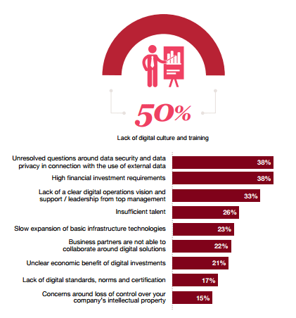 According to a PwC survey, industry experts report that the enthusiasm in the T&L industry regarding the adoption of new digital technology surpasses that of any other industry – 90% in the T&L industry as opposed to 83% in other industries. But the survey also opines that the lack of digital culture is by far the biggest hurdle that the industry faces, as evident from the illustration below.