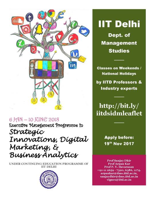IIT Delhi announces the call for applications for the Executive Management Programme in Strategic Innovations, Digital Marketing, & Business Analytics, which is planned from 6th January 2018 – 10 June 2018, and Classes to be held on Weekends/National Holidays. This will be an extensive programme of a minimum of 150 contact hours spread over 6 months.