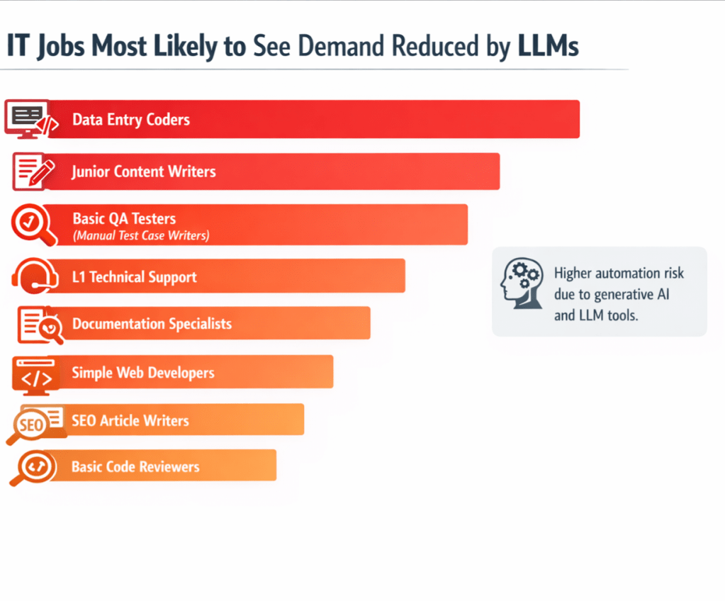 THe rapid advancement of large language models (LLMs) and generative artificial intelligence is reshaping the structure of work within the information technology sector. As organizations increasingly integrate AI tools into their software development and operational processes, certain roles that rely heavily on repetitive, rule‑based, or standardized tasks are likely to experience a significant decline in demand. This shift does not necessarily imply the complete disappearance of these jobs, but rather a transformation in the nature of work as automation absorbs routine activities.